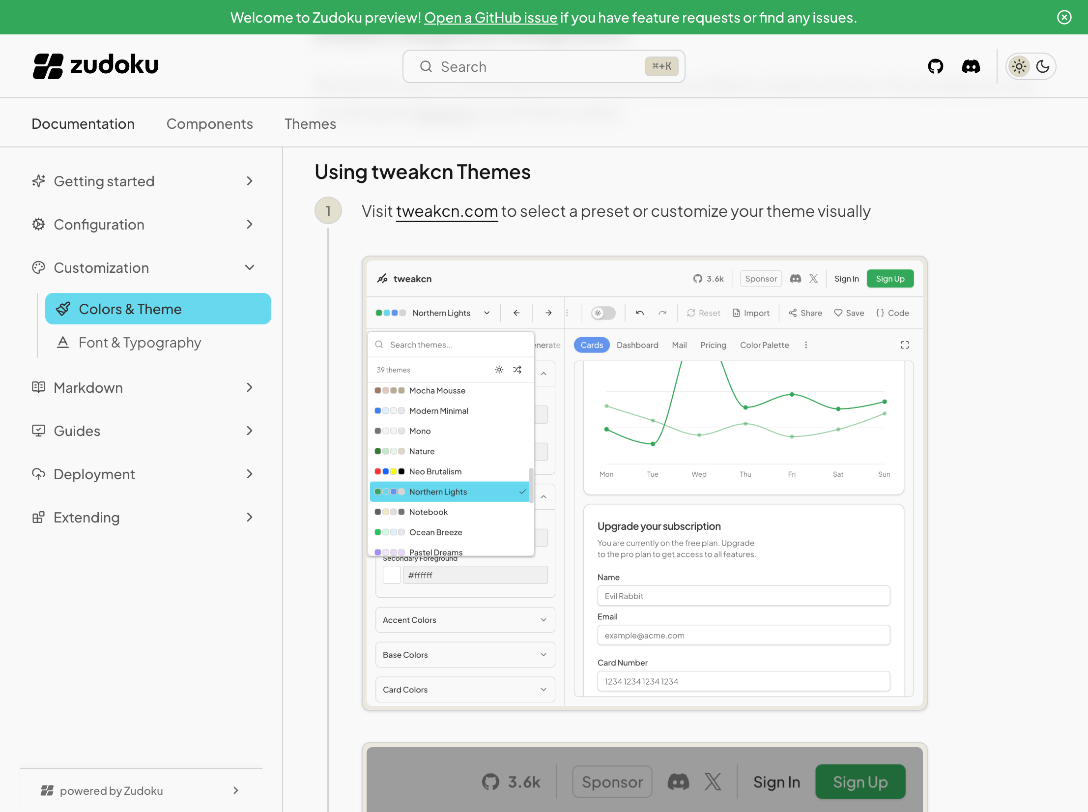 Zudoku provides flexible theming options allowing you to customize colors, import themes from shadcn registries, and add custom CSS. You can create cohesive light and dark mode experiences that match your brand.